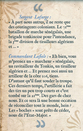 A colonial infantryman from Algeria, Abdelhadi has a keen intellect and is unusually cultured. While dreaming of becoming a teacher upon his return home, he also hopes to improve the understanding between the French and his fellow countrymen. A real bookworm, he is perceived to be a genuine intellectual by his puzzled comrades. Rather shy, he is nevertheless liable to deliver comments as sharp as a “Mauser” each time he intervenes.
